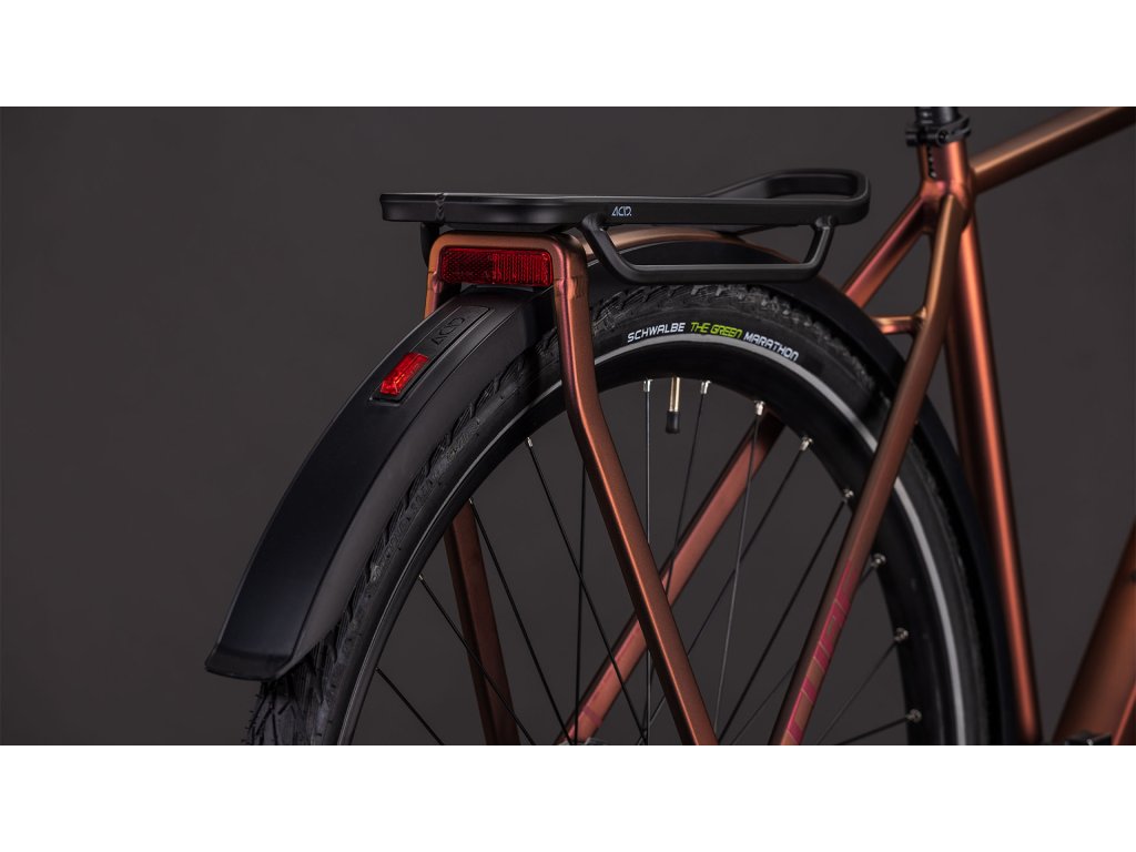 Konštrukčný tím CUBE sa postaral o to, aby model Kathmandu Pro mal všetko, čo potrebujete, a nič, čo nepotrebujete. Od elegantnej jednoduchosti integrovaného nosiča 3.0 po blatníky po celej dĺžke, predné a zadné svetlá a stojan CUBE FM – je to praktický spoločník na každý deň, ktorý je dostatočne odolný aj na dlhšie výlety. Vzduchová odpružená vidlica Suntour zjemňuje aj tie najdrsnejšie cesty a zaisťuje pohodlnejšiu jazdu. Pneumatiky Schwalbe Green Marathon používajú recyklovaný kaučuk, aby sa znížil ich vplyv na životné prostredie. Prevodovky Shimano Cues 2x10 vám poskytujú rozsah, ktorý potrebujete, aby ste ľahko zvládli akúkoľvek trasu. A hydraulické kotúčové brzdy Shimano zabezpečujú, že vždy môžete bezpečne zabrzdiť, bez ohľadu na to, čo veziete alebo aké je počasie. Mestská džungľa alebo vzdialený horizont, Kathmandu Pro vám kryje chrbát.